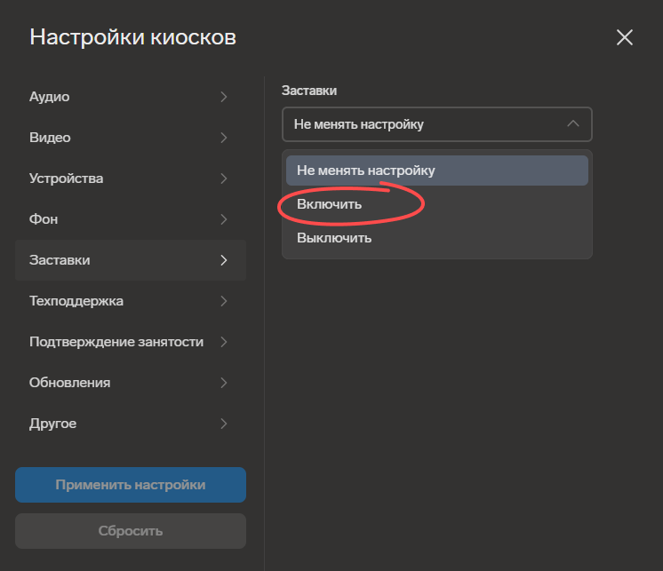 - Если заставка на этом киоске еще не настраивалась, переведите переключатель «Заставки» в активное положение.