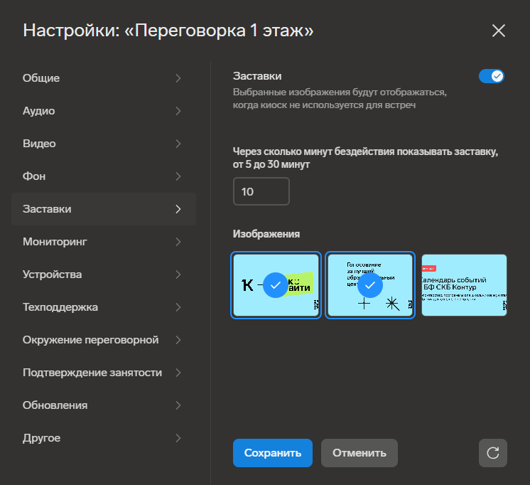 Заставки пропадут с экрана за несколько минут до начала встречи по календарю или если киоск ожидает подтверждение занятости.