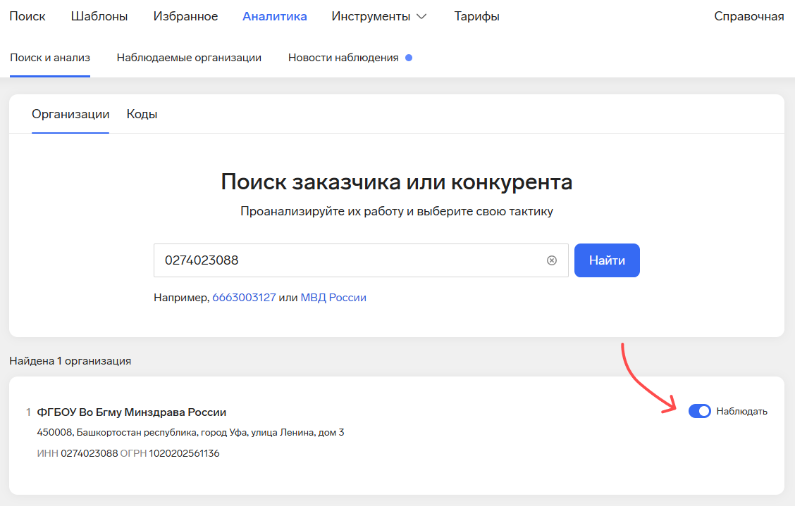 В разделе «Аналитика» найдите нужную организацию и установите переключатель «Наблюдать» в активное положение.