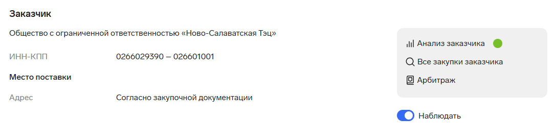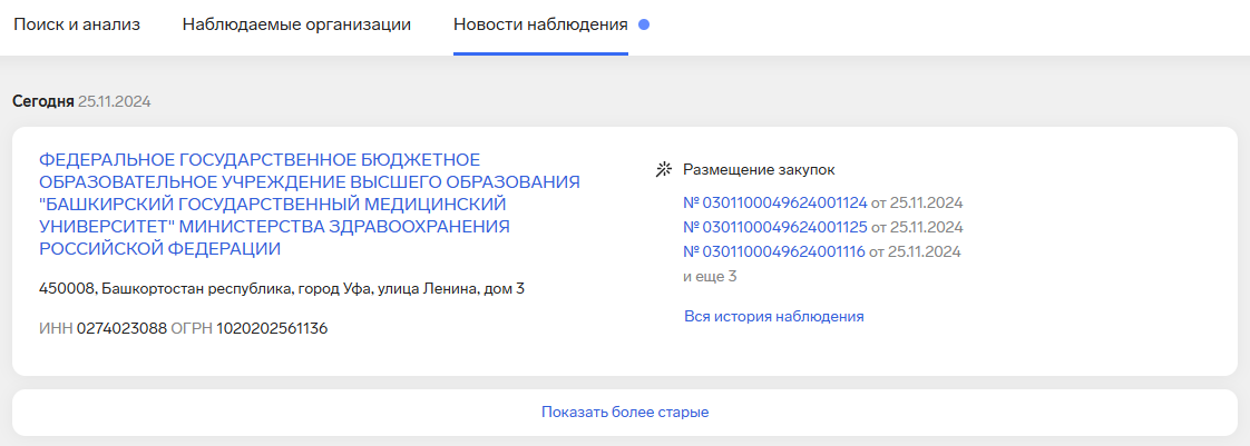 Таким же образом можно установить наблюдение за заказчиком со страницы закупки или за любой организацией при анализе заказчика или поставщика.