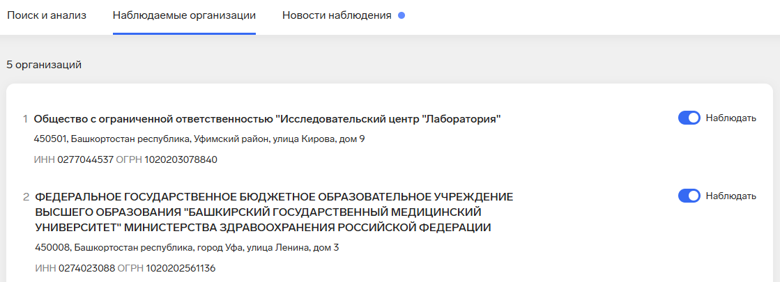 Организация появится на вкладке «Наблюдаемые организации». Здесь же можно снять организацию с наблюдения.